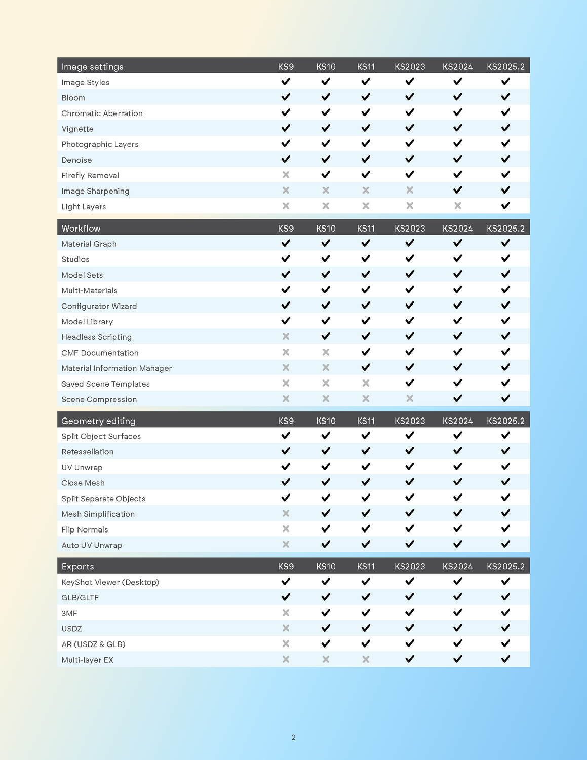 其他:材质图新增纹理随机化节点、支持 AMD GPU 渲染试验、(Pantone)Dualities 双色调色彩系统及色彩选择工具全面升级 KeyShot 版本功能对比表